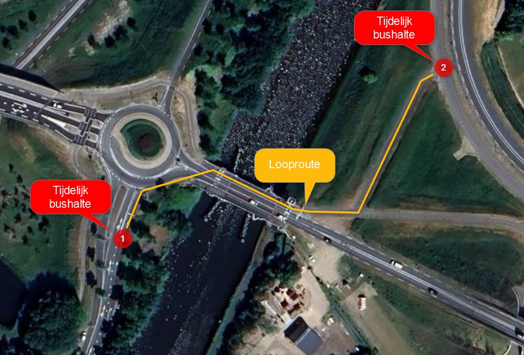 Tijdens de werkzaamheden is de Stolperbasculebrug afgesloten voor gemotoriseerd verkeer. (Brom)fietsers en voetgangers kunnen wel passeren. Gemotoriseerd verkeer kan omrijden via de Kooybrug (1) en volgt hiervoor de N9, N99, N249. Omrijden kan ook via de Schoorldammerbrug (2) via de N9, N504, N245. Verkeer komend vanuit Alkmaar in de richting van Schagen wordt op de N9 richting de N245 gestuurd.
